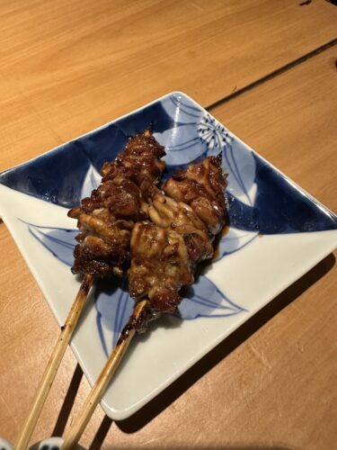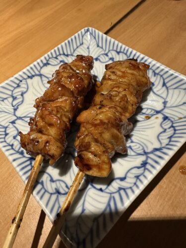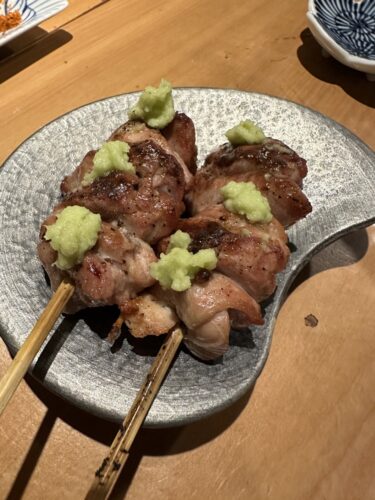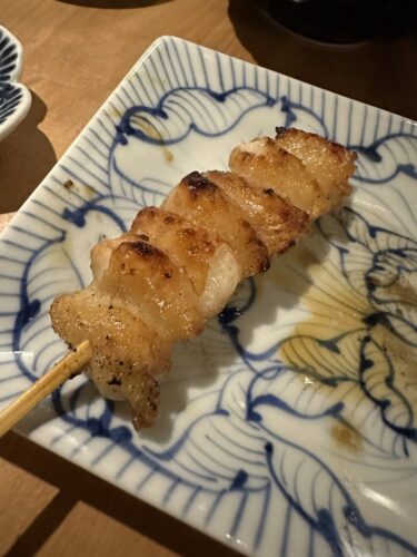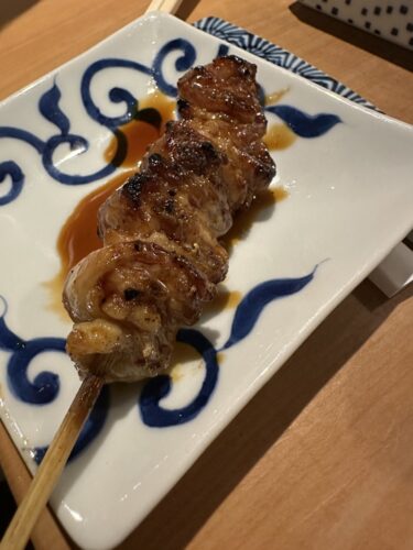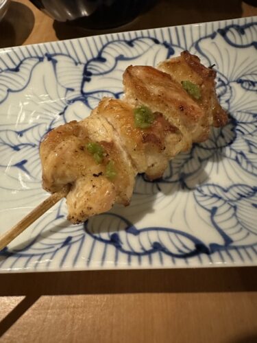 最初の串はふりそでから!一羽あたり50gしか取れないそうでとっても希少な部位です。とってもジューシーで美味しいです!