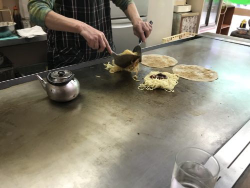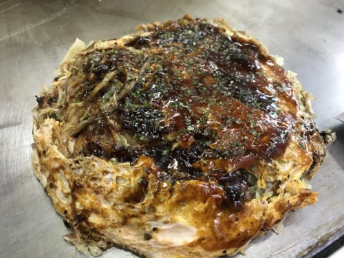 こちらのお店の特長としてはやはりしょぶり肉でしょうか!牛肉の脂がしっかりのっているお肉を小さく切ってお好み焼きに入れてくださるんです。この脂がとけて焼けてお好み焼きにいい風味とうま味を閉じ込める役割をしてくれています。この日はしょぶり肉入りでイカ天を入れていただきました~!