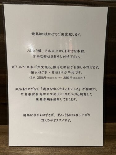 焼き鳥はおまかせでお願いします。本数をお伝えするシステムになっています。