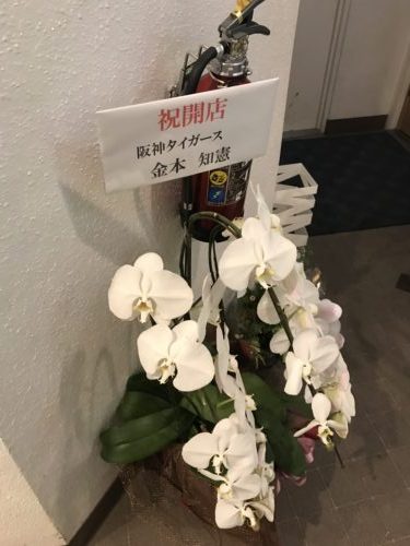 場所は粥膳さんが入っているビルの4階でした!お店の前にはなんと阪神タイガースの金本監督からのお花が!すごいですね~!