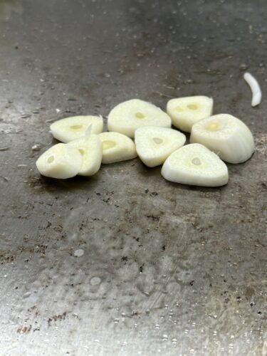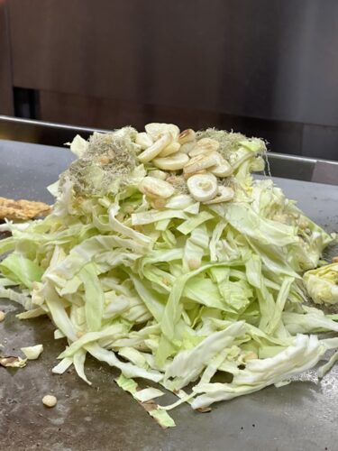 さて、いつものお好み焼きのいくちゃんに訪れてきました!いつもより遅めの時間に訪れました。すると鉄板の上でニンニクが焼かれていてとってもいい香りが!国産のニンニクをつかっていらっしゃるので香りがいい~!
