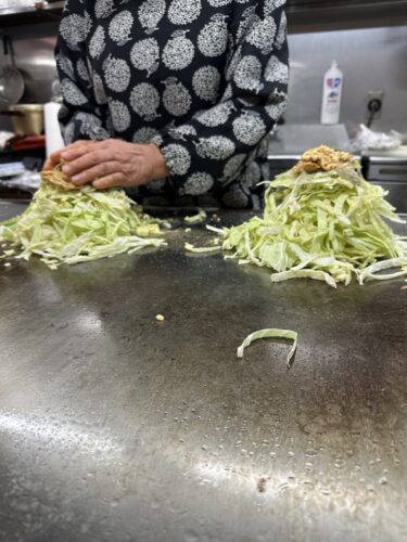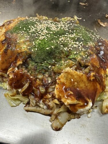 焼きあがったお好み焼きからニンニクのいい香りがします!美味しそう!頂いてみるとうまい!ニンニク入りかなりはまりそう~!