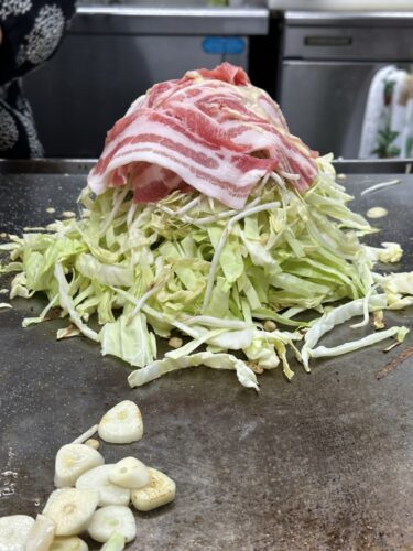 タワーのように積みあがったキャベツの上にたっぷりの豚肉をのせてくださって、脇でニンニクが焼かれていきます!いい香りがするな~!