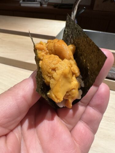 ウニは海苔巻きでいただきます。ほんと海苔の香りが素晴らしいですね。お鮨屋さんって海苔の仕入れってひと際神経使うっておっしゃいますもんね~。ウニも相当美味しいです!