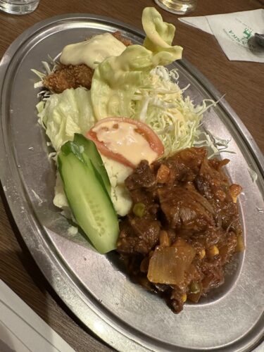 やっぱり私はAランチですよね~!この日は珍しくハンバーグではなくてハッシュドビーフ的な感じのでした。これめっちゃ美味しんですよ~!ソースがたまらないです!野菜もお肉もしっかり入っていました!白身魚のフライもいつも通り外はサクッとして中はしっとりで美味しいです!