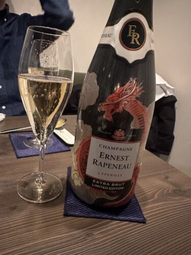 ここでさっぱりとシャンパンをいただきたいという話になりお願いしました!これまたかっこいいボトルですね!いただいてみるとこれが美味しい~!