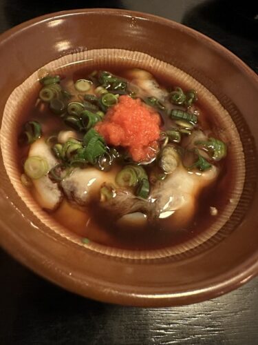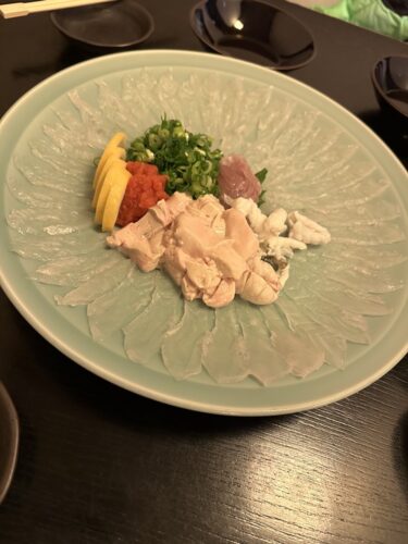 そこへカワハギの薄造りが登場しました!これがまた最高!なんて美味しいんだ~!肝もたっぷり入っていました!肝をポン酢にとかしながら一緒に白身をいただくとより一層美味しくなりますね~!