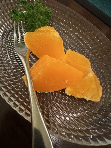 果物をきっていただきました!これがとっても美味しい!ゼリーのような食感でした。なんだろう?甘平とかそんな感じなのかな?