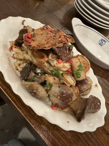 ここでお料理が登場しました!砂肝とコンフィとキノコのソテーをいただきます。とっても美味しそうですね~!いろんなキノコがたっぷり入っています!ボリュームもたっぷりでありがたいですね~!コンフィもワインにとってもあいます!