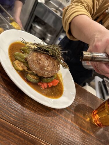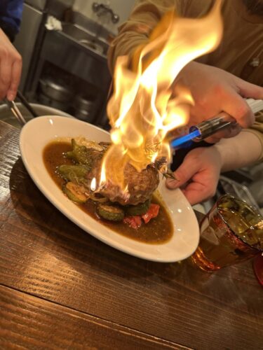 登場したハンバーグはすぐにはいただかないです。ファイヤがありますので!(笑)上にのっているローズマリーにひをつけると一気に燃え上がります!その場に居合わせた皆さんが一斉にお~~~~って!(笑)