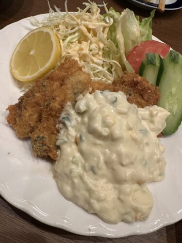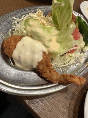 まずは冬季限定のカキフライをお願いしました!アラスカさんの牡蠣は立派な大きさで粒がしっかりしています。そして自家製のタルタルをたっぷりつけていただきます!めちゃうま~!最高です!