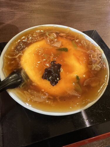 そして私の天津丼が登場しました!おいしそうでしょう!アツアツの餡がたっぷりかかっています。リニューアルする前の店舗ではこの餡がとんでもなくこぼれているのが通常でしたがお客様からこぼさないでほしいとのリクエストが多かったそうでこぼすのは現在はやめているそうです。それでも十分たっぷりですが!昔はもう食べる時に丼から餡があふれまくって食べ終わったときには結構おぼんにたっぷり餡が(笑)