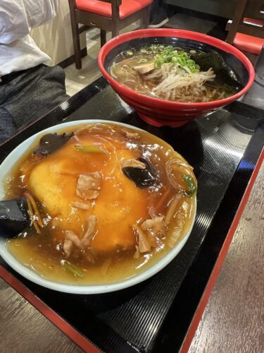 着席したと同時にまずは名物天津丼とラーメンのセットが登場しました。体を鍛えている同級生なのでしっかり食べないとすぐにお腹減るそうです。(笑)