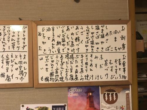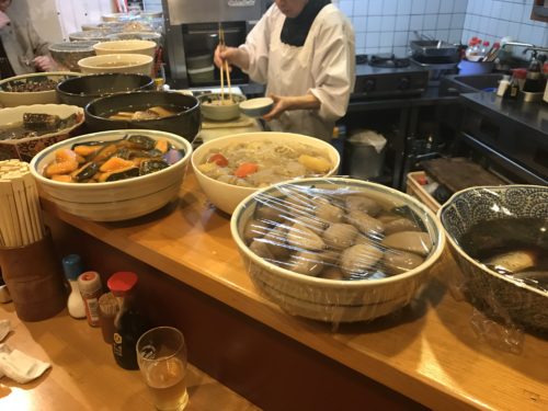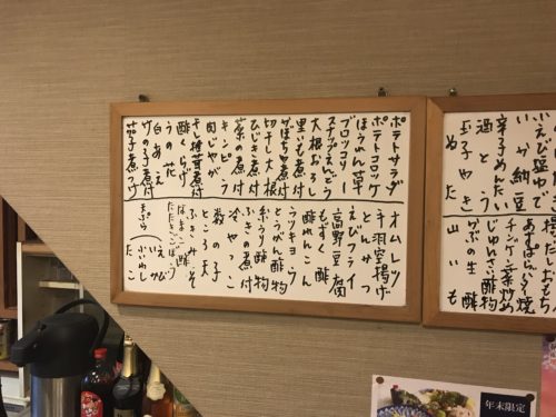 メニューをみながらいろいろとお願いしました!カウンターの上にもたくさんの一品料理が並んでいます。こういうお店ってもうほとんどないですからね~。本当に落ち着きます。お母さんにはいつまでも元気でいてほしいですね。