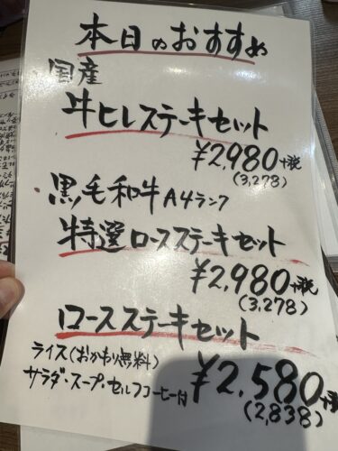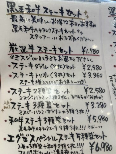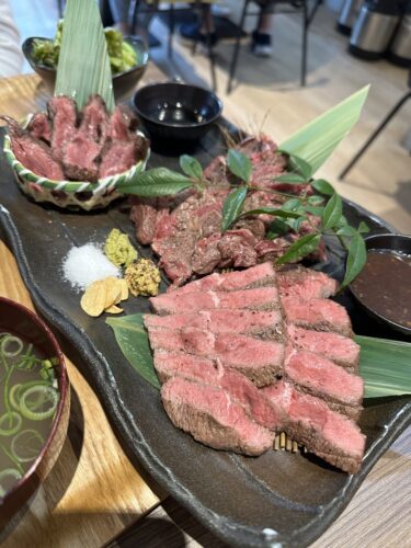 一番人気で一番のおすすめのステーキ3種盛セットがまず登場しました。