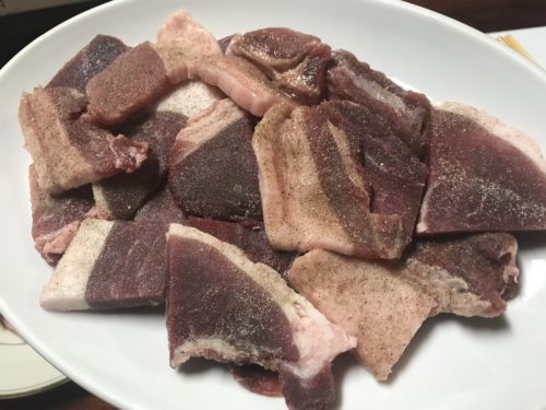 お待ちかねのいのししが登場しました!今年はすべりだし順調なんだそうです!去年よりはだいぶんいいとおっしゃっていました。猟の話を聞きながらいただくのが楽しいんですよ~!脂身がとっても甘くておいしい~!