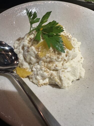 続いて甘夏とマスカルポーネの白和えをお願いしました!本来は金柑も入るそうなのですがこの日は金柑がきれてしまって甘夏たっぷりにしてくださいました。甘夏の酸味とみずみずしさがとってもいいですね~!白和えも大好物なんですよね~!