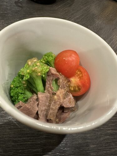 最初のお料理はブロッコリーと牛タンとトマトです。何気ないお料理ですがほんととっても美味しい~!