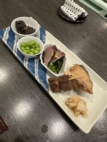 続いて盛り合わせが登場しました!ナス、グリーンピース、牛肉、サワラ、ハマチ、鬼おろし!グリーンピースを久々にいただきましたが美味しい~!こうしていただくのが久々でしたのでとっても新鮮に感じました!牛肉も美味しい~!さすがです!