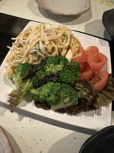 女将さんの手作り料理もとっても美味しんですよね~!スパゲティサラダとブロッコリーとトマトのサラダもとっても美味しい~!誰も残すことなくペロリです!