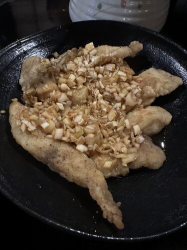 白身魚の南蛮風が登場しました!これは初めていただくお料理でしたが、白身魚のフライにしっかりと南蛮ソースがからんでてほんの少し八角もきかしてあったのかな?めちゃめちゃ美味しかった~!