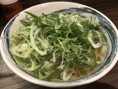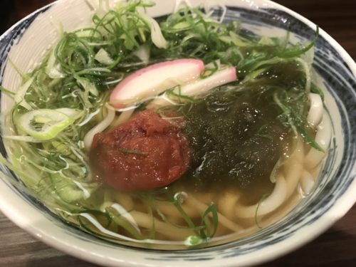 まずは私の梅とろろ昆布うどんが登場しました!ねぎをたっぷりにしているので梅やとろろが見えない!ねぎをよせてみると、大きな梅がしっかり入っています!