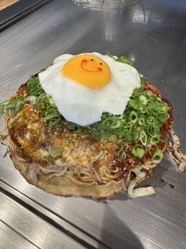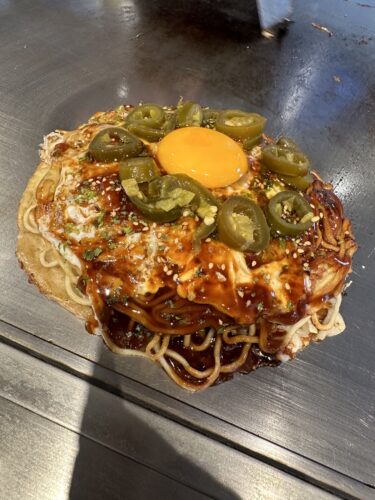 焼きあがったお好み焼きの上にハラペーニョと生卵を全卵でのせていただきました!ユキちゃんのお好み焼きはヘラがす~っと入っていきます。さすがの焼き加減ですね!