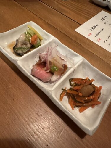最初は前菜の3種盛が登場しました!牡蠣やローストビーフが!美味しいです!