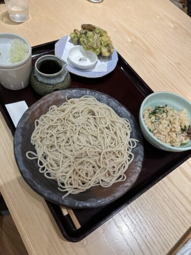 まずはもりそばの定食が登場しました!天ぷらと炊き込みごはんがついていました。美味しそう!