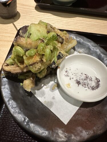 まずは天ぷらからいただきます。枝豆、椎茸、あと野菜がいつくか入っている贅沢な天ぷら!これがめちゃ美味しい~!これはお得感もでてきますね~!