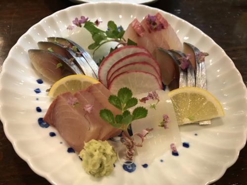 お刺身はしめ鯖、カンパチ、生イカです!しめ鯖おいしい~!カンパチも身の張りがすばらしいです~!あ~幸せです!