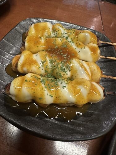 メニューの中で気になったのがチキンチーズカレー!想像はできたのですがどうしても頼みたくって!登場した串からカレーのいい香りが!上にはチーズがとろっと!いただいてみると、めちゃ美味しい~!チーズとカレーの相性は最高ですね!