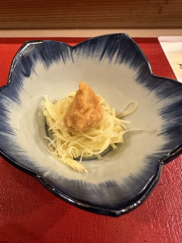 先付はじゃがいもの千切りと生からすみ!これめちゃ美味しい~!やるじゃないですか~!