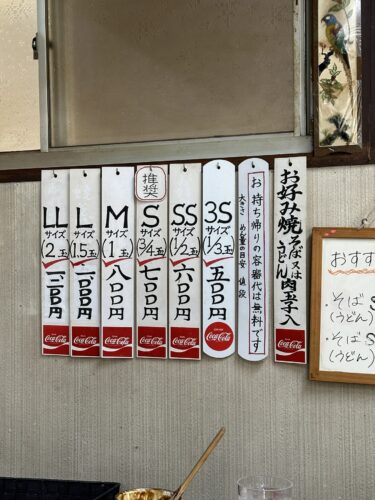 お店に入ってカウンターに座ってメニューをみてみるとみたことないメニューが!SSとかSとかMとか!サイズでお願いするようです。それにしてもリーズナブルなお値段設定ですね!