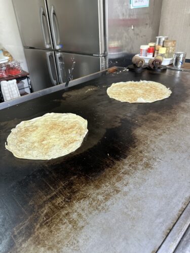 鉄板の上に生地をひいて、、ん?生地が大きくない?まあ初めてなので落ち着いてみておきましょう。