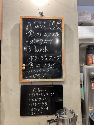 さて、夜飲んだ後にいつもお世話になっているアラスカさんに訪れてきました。深夜の2時まで美味しい洋食がいただけるお店です。この日もいつものメンバーで着席(笑)。今日のランチもチェックしておきます。