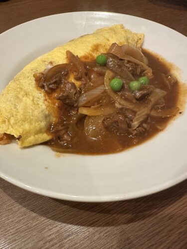 私がいままでお願いしたことがないオムハヤシが登場しました!オムライスの上からたっぷりハヤシソースがかかっています。一口いただくとめちゃうま~!