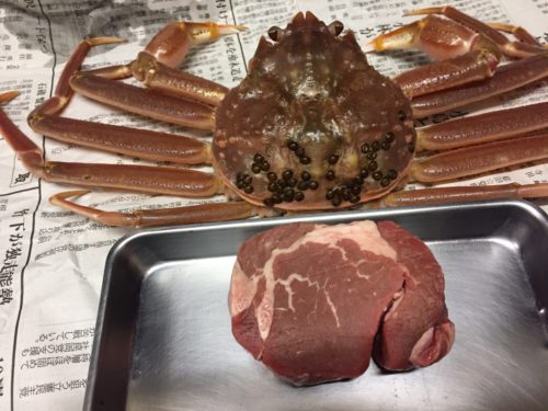 お昼くらいに大将からメールが!添付されていた写真を見ると、今夜の献立が~!ヒレ肉とカニ!ありがたいです~!