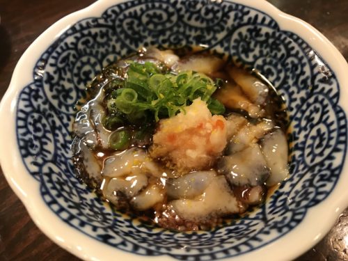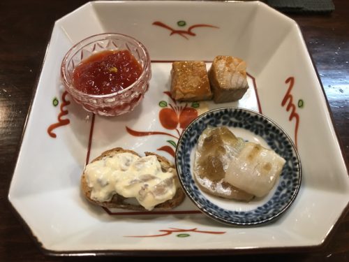 ということでまずは生ビールで乾杯させていただいて、続いて先付をいただきました~!この日はすじこが入っていました~!ヒラメのカルパッチョ仕立ても超おいしい~!