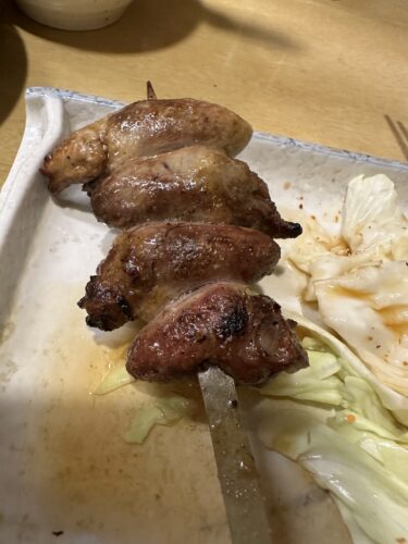 ここで焼鳥を!まずは白肝からいただきます!いつもながらの美味しさです!