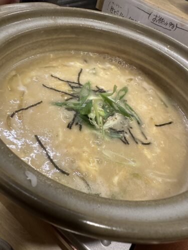 ここでさきほど美味しくいただいたお鍋に麺とごはんを入れていきます。私はお腹がいっぱいになりかけていたので麺はやめてご飯をいれていただきました。この雑炊が過去一美味しい~!なんという美味しさなんでしょうか!鶏のいいお出汁がでていました!