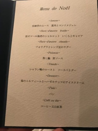 さて、毎年恒例のルペールさんのクリスマスディナーをいただいてきました!この特別料理はシェフがかなりの意気込みでのぞんでおられますからね~!メニューを見てみるとなんとシャラン鴨が!インフルエンザの影響で日本には当分入ってこなかったのですが、、