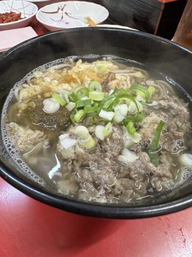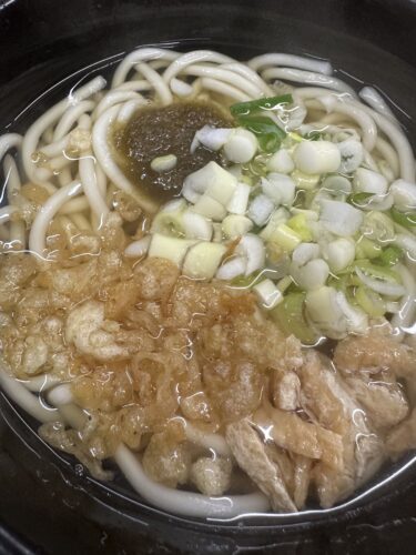 続いて私がお願いした細うどんが登場しました!細うどんって広島の呉が名物なんですよ~!戦艦乗りの方々が多かったこともあってすぐ湯がくことができてすぐ食べれるということで細うどんが登場したんだとか。