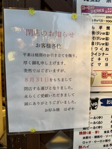 さて、29年前にオープンされてからいままでお世話になってきたお好み焼きのはぜやさんが今月末で閉店されるというので伺ってきました。