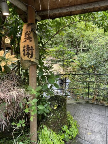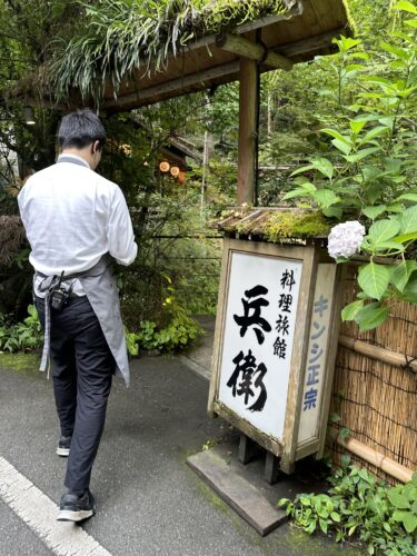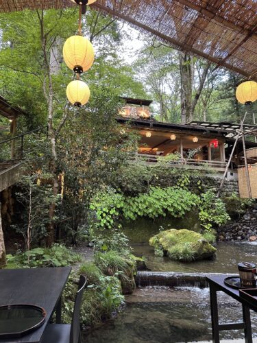 受付の方が案内してくださって川床へ。兵衛さんのカフェには行列が!みなさん涼を求めていらっしゃいますね。すぐ目の前に小さな滝が!涼しさが増しますね!とっても居心地がいいです。