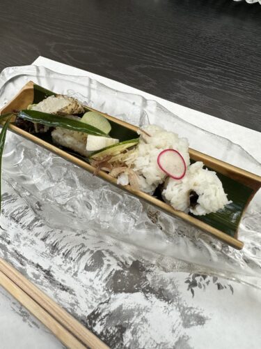 続いて鱧のお刺身と湯引きが!鱧しゃぶの前にどのような鱧が登場するか楽しみにしていたのですが、安心しました!とっても美味しい~!仲居さんもきさくにお話してくださって、私が大谷翔平選手に少し似ていると(笑)