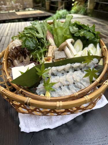 そこへたっぷりのお野菜と鱧が登場しました!まずは鱧からしゃぶしゃぶしていただきます。最初は仲居さんがやってくださいました。あまりしゃぶしゃぶしすぎないのがいいそうです。いただくとめちゃくちゃ美味しい~!鱧しゃぶ最高!お野菜と一緒にいただいてさらに美味しい~!