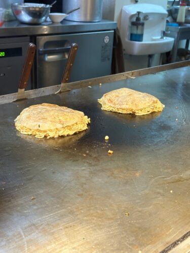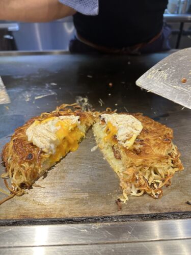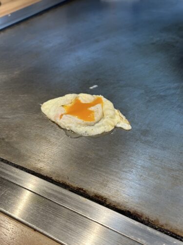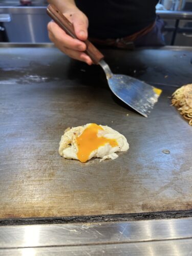 目の前で目玉焼きをつくるのかなと思ったら半熟状態で黄身の部分をわってそこへお好み焼きを上から!なるほど~!