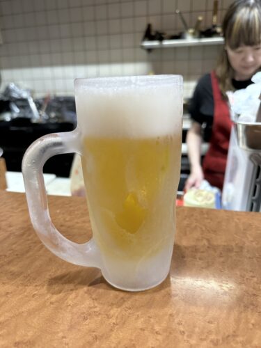 晩酌セットにはドリンクと小鉢2品、刺身の盛り合わせがついてきます。まずは生ビールで乾杯させていただきました。