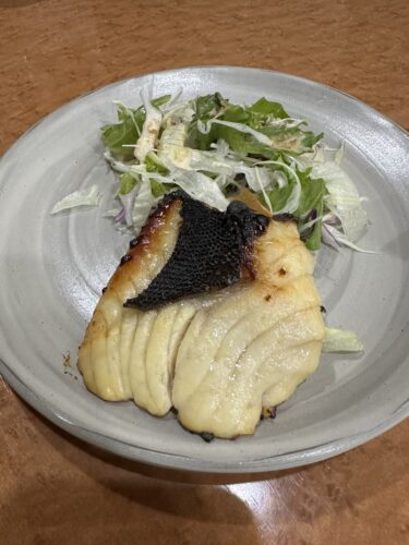 そして続いて小鉢の2品目が!まさかの焼き魚が登場しました!焼きたてほやほやのスズキの西京焼き!すごくないですか?2000円もかからないお値段でお刺身盛り合わせや生ビールのみならずスズキの西京焼きが登場するなんて!日本で一番お得なセットなんじゃないかなって思います。